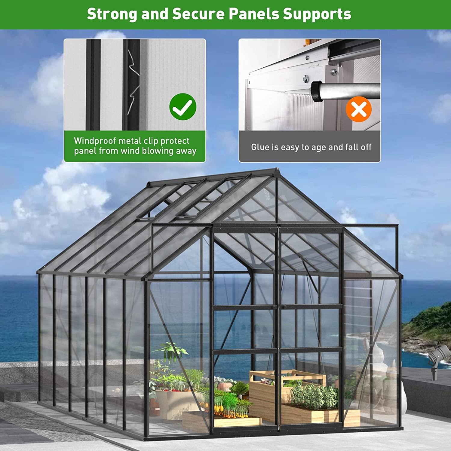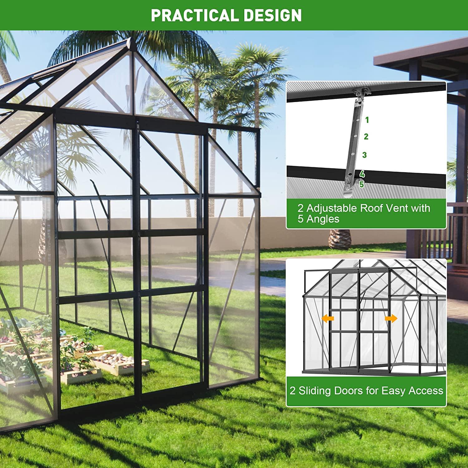 8'x12' Polycarbonate Greenhouse 2 Sliding Doors 2 Vents Window Walk-in Greenhouse for Outdoor