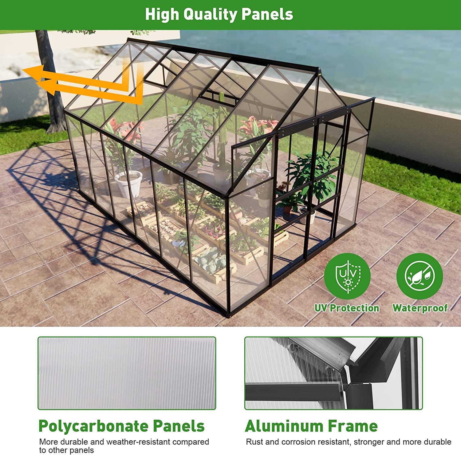 Polycarbonate Panels: This heavy duty greenhouse has 4mm high qualitypolycarbonate panels that protect plants from harsh UV rays, retain heat, and allow sunlight to pass through for healthy growth. Meanwhile, plug-in connections between PC panels are more convenient for assembly.