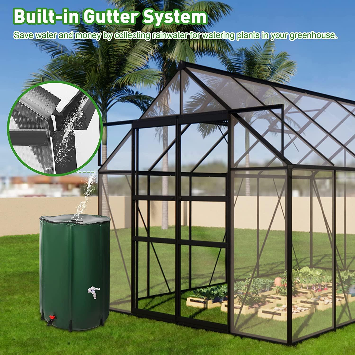 Built-in Gutter System: The walk-in greenhouse with effective water drainage & collection on both sides to prevent crushing the conservatory. Attach a hose to collect rain for watering plants inside hot house.