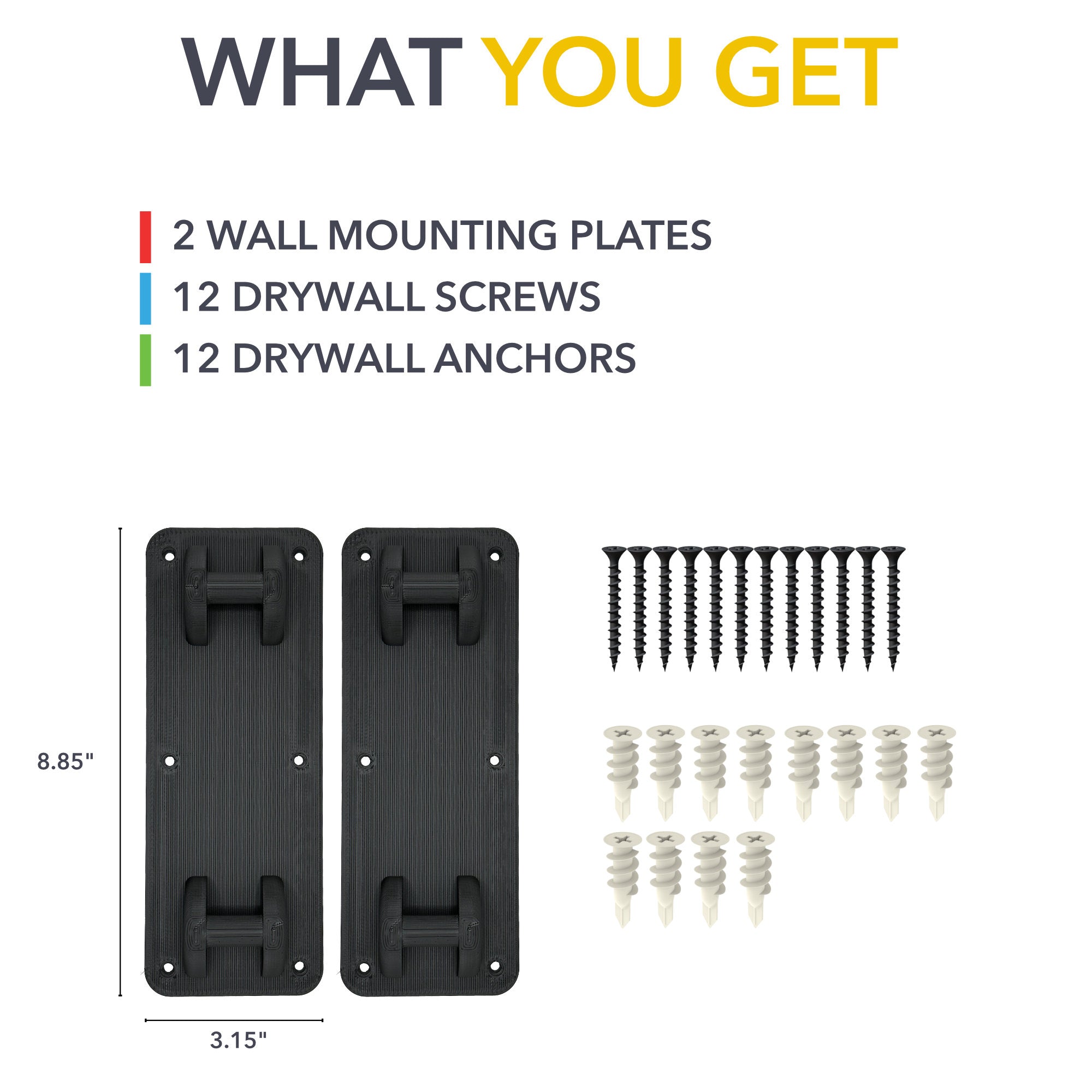 The TWRAPS wall mount plates offer a secure storage solution for Rivian's cargo cross bars when they are not in use, helping you keep your garage tidy and organized. It works with the same 2-stage snap-on mechanism as on your truck/SUV. Built to sustain 800lbs gear attached to the cross bars. Easy to install, includes drywall anchors and screws. Patent pending design.