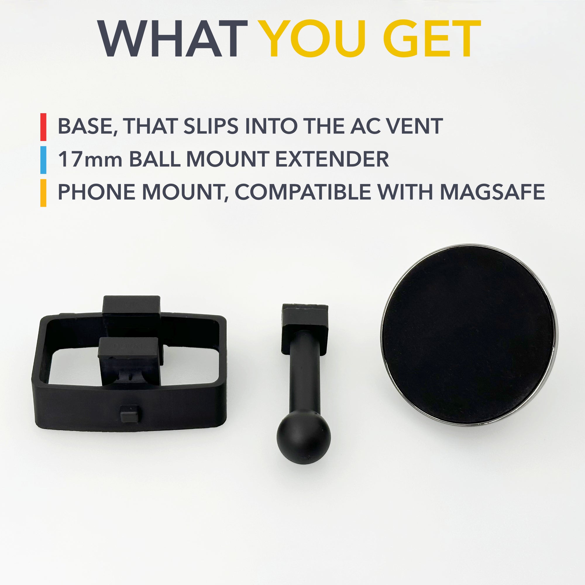 🔒 Secure Attachment: The holder features a flexible plastic base and sturdy extender that inserts into the vent, providing a secure hold for your phone. The ball mount MagSafe magnet ensures your device stays in place even on bumpy roads.