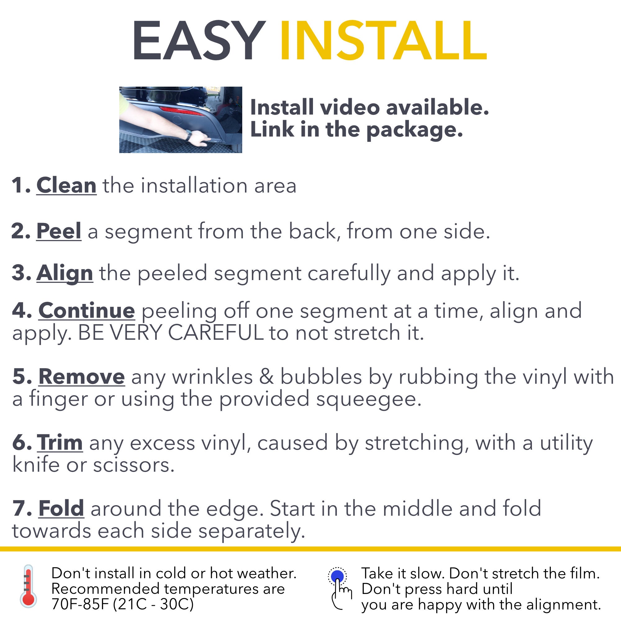 - Transfer Tape for Stability: To ensure a hassle-free installation, the vinyl wrap comes with transfer tape. This additional layer stabilizes the wrap during application, reducing stretching and misalignment, resulting in a more accurate installation.