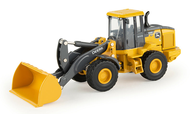 John Deere 544P Wheel Loader - Prestige Collection Features include: • Updated graphics and logos • Operating loader and dump arms with bucket • Pivoting bodies • Opening side panels exposing the detailed engine and cooling system This is a genuine Ertl product.