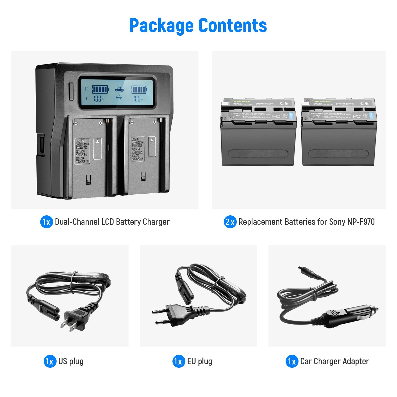 • Best Replacement Battery for for Sony NP-F970 NP-F960 NP-F975 NP-F950 NP-F930 NP-F330 NP-F550 NP-F570 NP-F750 NP-F770; Suitable for Neewer CN160,FW568 F100 F200 FW700 and other LED Video Light or Monitor; Short-circuit protection and over-charge protection