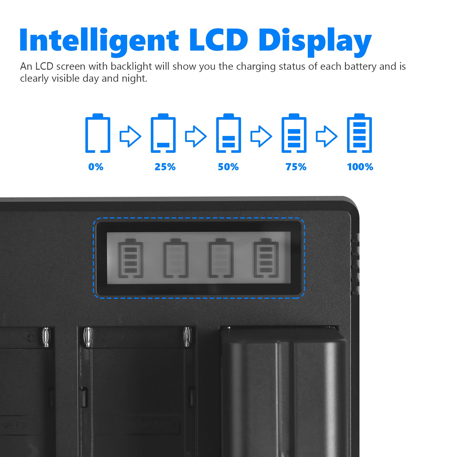 • Use the 4-channel charger to juice up four NP-F970 batteries simultaneously. It features 2A currents when charging 1 or 2 batteries and 1A currents when charging 3 or 4. A backlit LCD panel shows the charging status of each battery.
