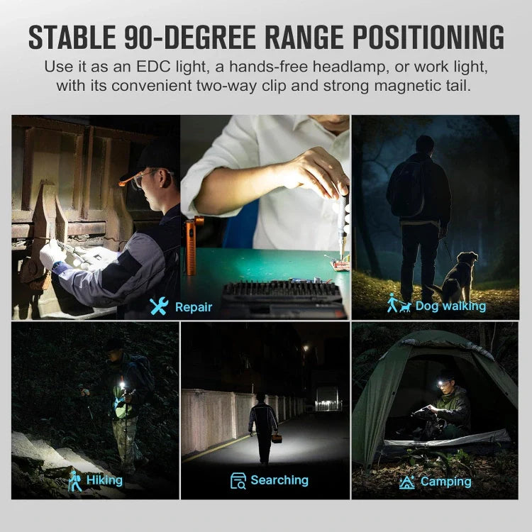 Extremely Multi-Functional: An EDC light? Headlamp? Reading/Work light? All of them -- thanks to its rotatable head, together with a dual-way clip that enables deep carry and a magnetic base, makes it ideal for repairs, outdoor adventures, emergencies, industrial work, and nighttime activities.