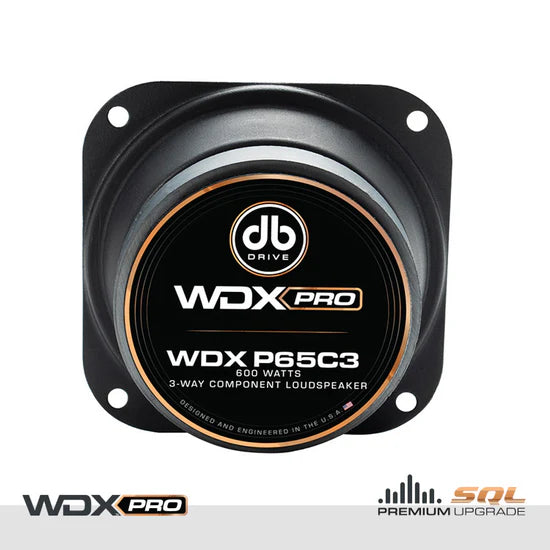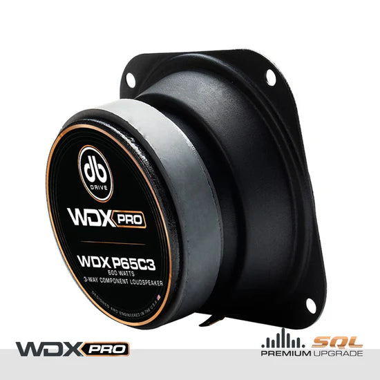 The DB DRIVE WDX P653C 3-way component system incorporates an additional midrange driver with a sealed-back design for enhanced imaging and improved sound isolation. This results in superior sound quality and high output. Designed for audiophiles, it provides a premium listening experience. • Multi-Mount Elliptical Waveguide Tweeter Design: Ensures wide, consistent high-frequency dispersion from any angle for precise sound imaging. • Sealed-Back High-Frequency Midrange: Provides improved sound staging and clarity • Paper Midrange Cone: Delivers smooth, efficient midrange response with minimal distortion, ensuring crystal-clear audio. • Optimized Frequency Bandwidth: Reproduces natural, seamless sound across the entire frequency spectrum. • SQL-Tuned 12dB Passive Crossover: Precisely separates frequencies to optimize performance for the tweeter, midrange, and woofer drivers. Power Handling: • Dynamic Power: 600W • Nominal Power: 300W